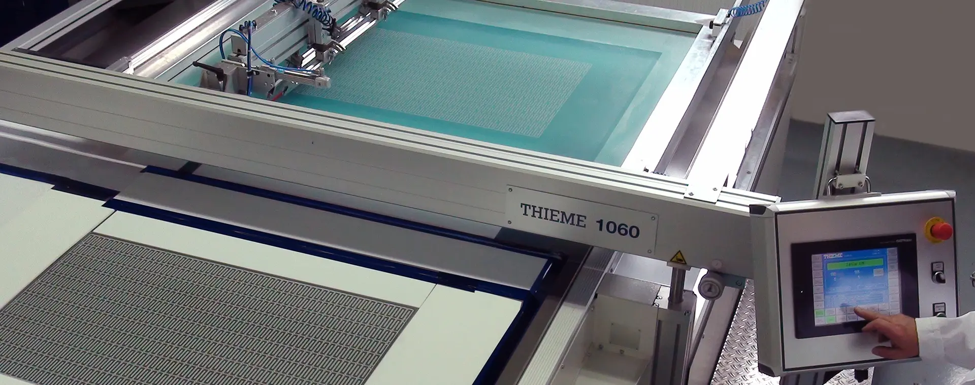 Półautomatyczna maszyna do sitodruku z ruchomym stołem drukarskim do materiałów sztywnych i elastycznych.