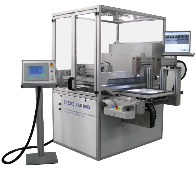 Wysoko precyzyjna maszyna do sitodruku z automatycznym wyrównywaniem sita i podłoża za pomocą systemów kamer CCD.