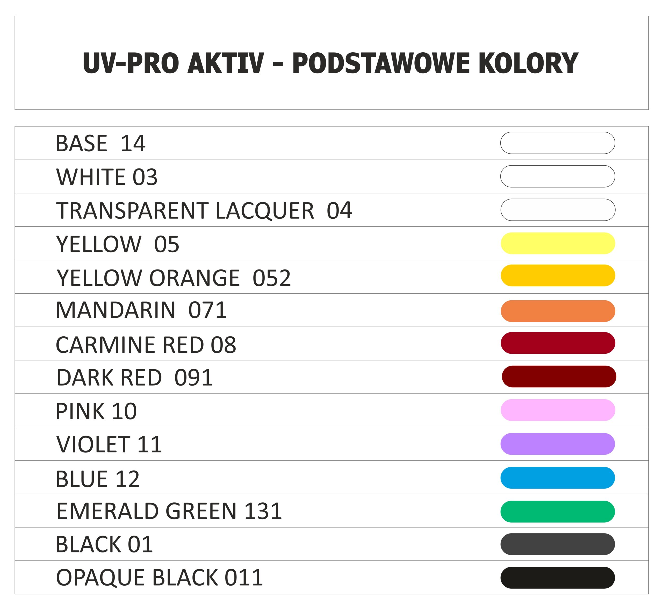Farby z serii UV-PRO AKTIV są przeznaczone do tworzenia nadruków z wysokim połyskiem na detalach wykonanych z różnych tworzyw sztucznych. Są one szczególnie często stosowane w branży opakowań, między innymi do tworzenia nadruków na twardych i półtwardych pojemnikach poddawanych obróbce płomieniowej. Farba szybkoutwardzalna, odporna na wilgoć, na ścieranie oraz liczne środki chemiczne.