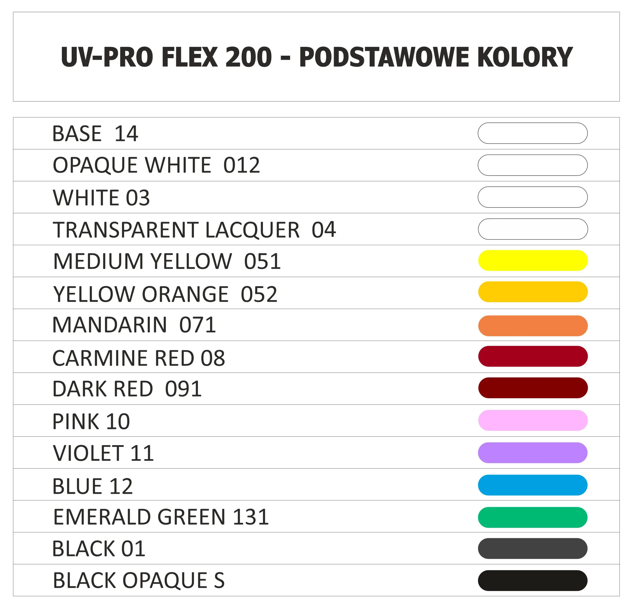 Seria wysokoelastycznych i wysokokryjących farb UV-PRO FLEX 200. Są to gotowe do użycia farby UV, specjalnie zaprojektowane do druku na poliwęglanie, poliestrze, PCV i PMMA.