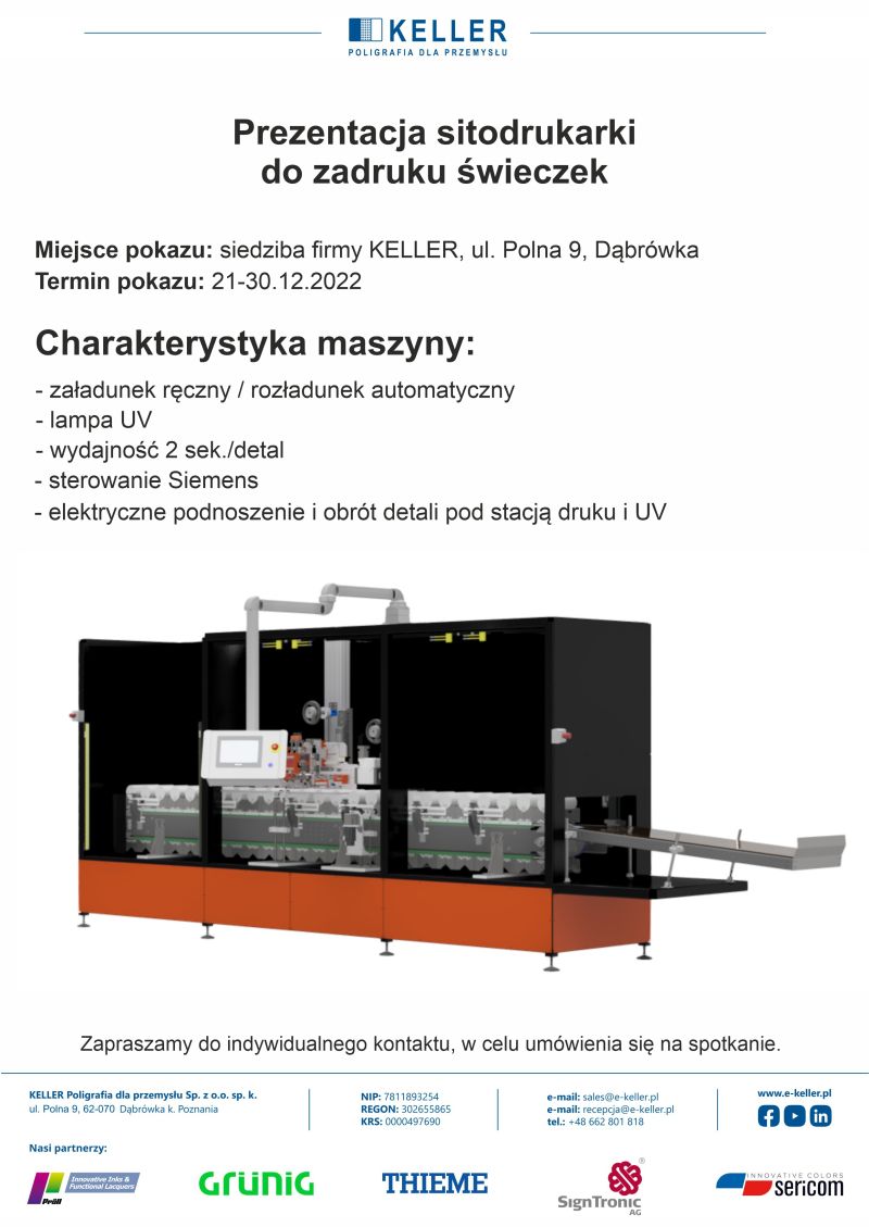 Zobacz jak pracuje najnowsza ciekawa maszyna Keller – sitodrukarka do zadruku świec . Prezentacja maszyny odbędzie się w siedzibie naszej firmy.